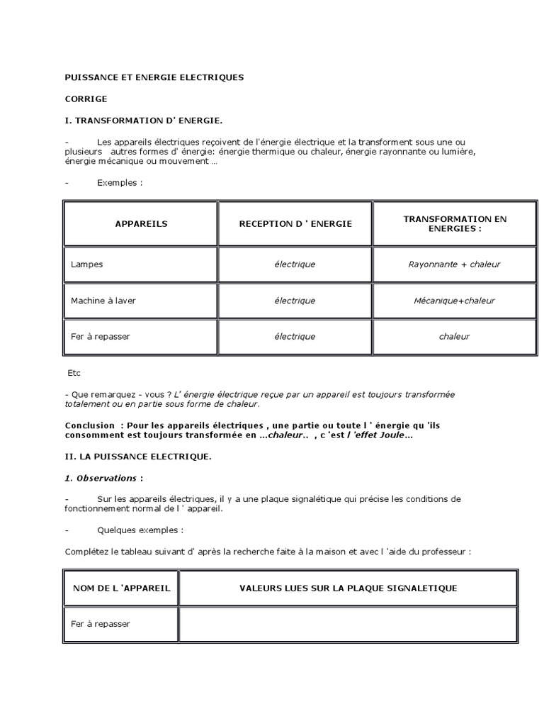 A puissance délivrée égale, plus la tension est élevée et. P = u × i puissance (en watt w). Effet joule le passage d'un courant dans un conducteur produit un dégagement de chaleur. Calculer l'énergie dissipée par effet joule pour une 1.5 heures de repassage.