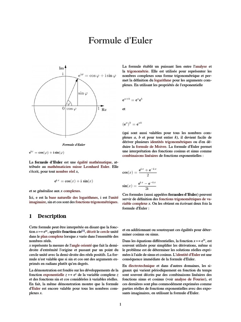Formule D'euler Sinus. La formule d'euler est une égalité mathématique, attribuée au mathématicien suisse leonhard euler. Ne doit pas être confondue avec d'autres formules dues à euler, comme celle concernant les graphes planaires.