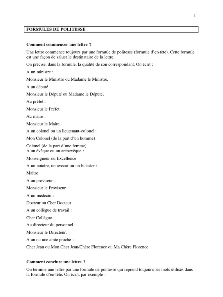 Formules De Politesse Dans Les Conversations Interculturelles Ecml At from img.yumpu.com Formule de politesse — politesse la politesse, du latin politus qui signifie uni, lisse, brillant, regroupe un ensemble de comportements sociaux entre individus visant à exprimer la reconnaissance d autrui et à être traité en tant que personne ayant des sentiments.… … Il y a autant de formules de politesse que de destinataires possibles. Comment terminer une lettre de façon appropriée ?